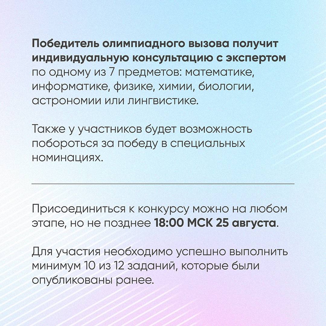 Победитель олимпиадного вызова получит индивидуальную консультацию с экспертом по одному из 7 предметов: математике, информатике, физике, химии, биологии, астрономии или лингвистике.