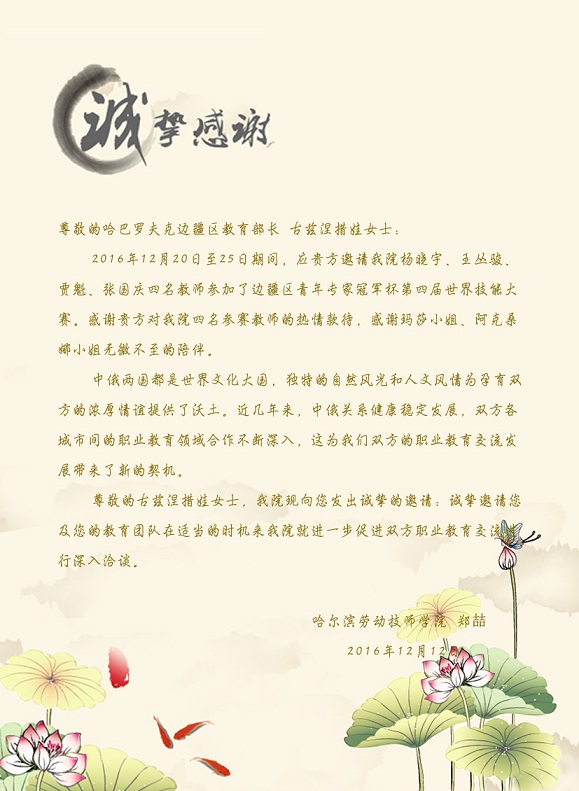 Уважаемая госпожа Кузнецова, Харбинский колледж рабочих и технических специальностей выражает Вам искреннюю благодарность: приглашаем Вас и вашу команду, в удобное для вас время, посетить наш колледж и обсудить дальнейшее взаимодействие в сфере профессионального образования.