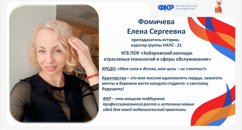 - Елена Сергеевна Фомичева, преподаватель истории Хабаровского колледжа отраслевых технологий и сферы обслуживания;