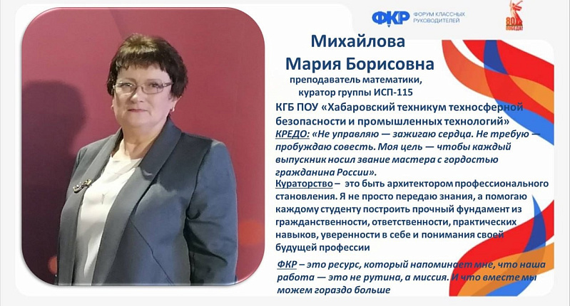 - Мария Борисовна Михайлова, преподаватель математики Хабаровского техникума техносферной безопасности и промышленных технологий;