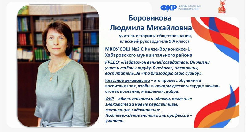 - Людмила Михайловна Боровикова, учитель истории и обществознания средней школы № 2 с. Князе-Волконское-1;