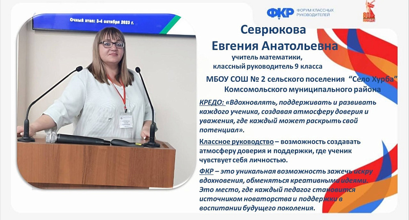 - Евгения Анатольевна Севрюкова, учитель математики средней школы № 2 с. Хурба;
