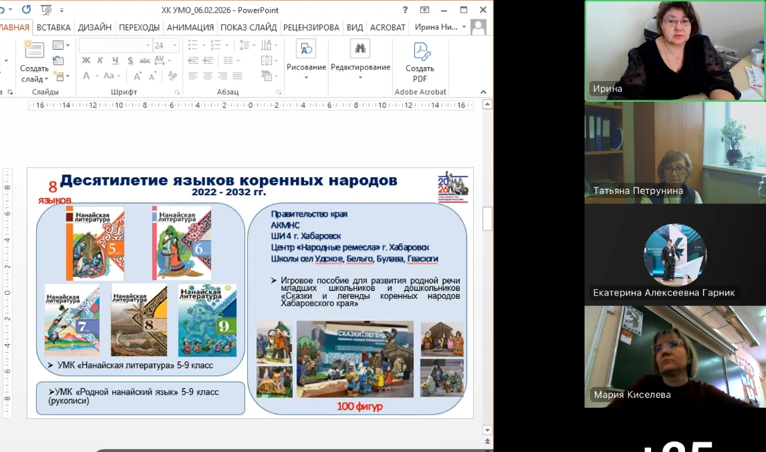 Также были представлены результаты экспертизы учебных пособий «Нанайская литература» для учащихся 5 класса и для учащихся 6 класса общеобразовательных организаций авторов И.Н. Кравченко, Е.М. Крадожен-Мазурова, У.А. Пассар. Резензентами выступили Заксор Л.Ж., к. фил. н., доцент кафедры алтайских языков, фольклора и литературы института народов Севера РГПУ им. А.И. Герцена, и Берелтуева Д.М., к. фил. н., исследователь удэгейского языка, традиций и современной культуры коренных малочисленных народов Севера, Сибири и Дальнего Востока. РУМО рекомендовало учебные пособия по нанайской литератуе для учащихся 5 и 6 классов к изданию с целью использования в образовательном процессе в общеобразовательных организациях Хабаровского края.