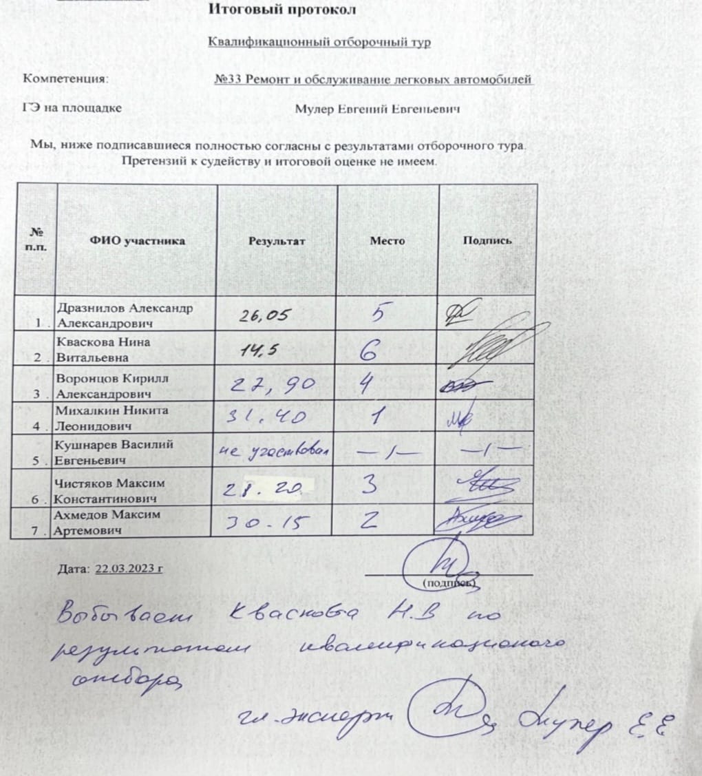 - Итоги Квалификационного отбора по компетенции Ремонт и обслуживание легковых автомобилей