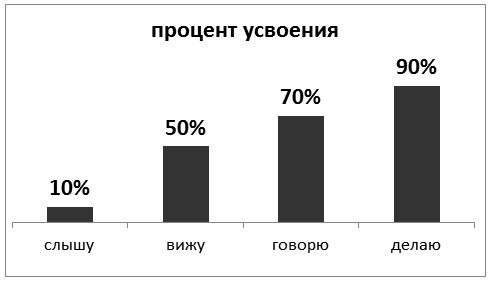 Мы знаем, что познание происходит с помощью включения разных сенсорных систем. Этот принцип реализуется через применение «золотой» формулы эффективного обучения: «слышу – вижу – делаю». Проведенные в США в 1980-х годах исследования National Training Laboratories in Bethel (Maine) позволили обобщить данные относительно эффективности (средний процент усвоения знаний) различных методов обучении взрослых. Эти результаты представлены на рисунке. Они строго научно подтверждают древнюю мудрость, сформулированную в китайской пословице: