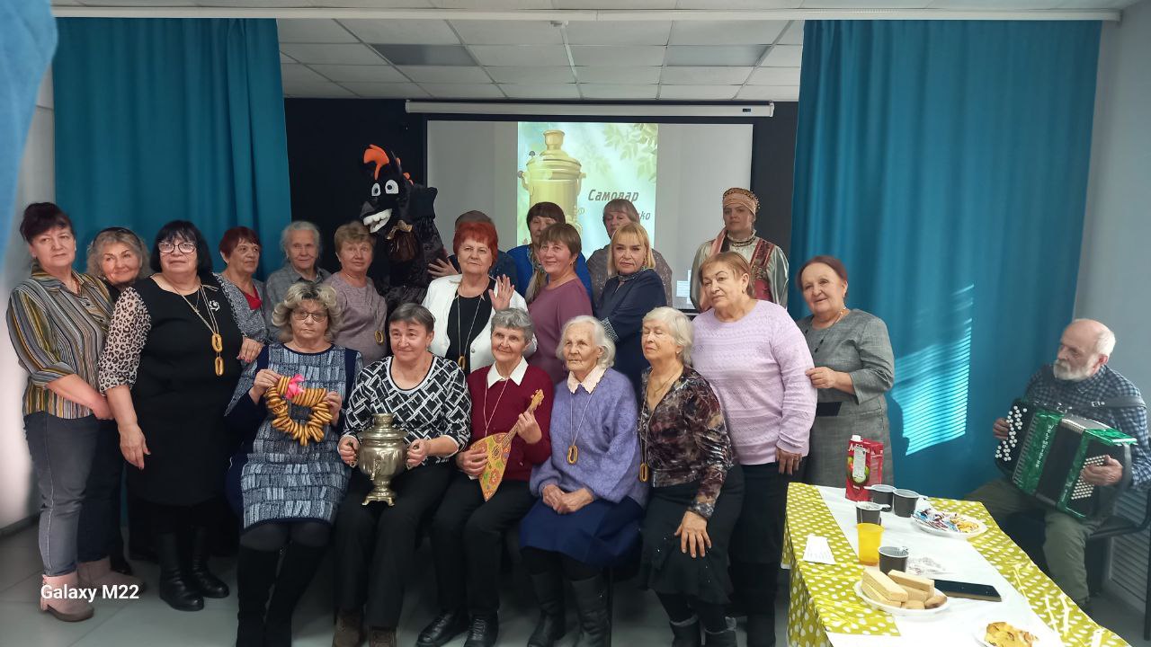 С.С. Крусанова на правах хозяйки встречала гостей у самовара, с пышными пирогами и ароматным чаем. Встреча так и называлась «Мы за чаем не скучаем!» Песни, шутки, интересные конкурсы увлекли присутствующих. Баянист Шелепов Ю.П. подхватывал одну мелодию за другой. И какой праздник без подарков? Благодаря спонсорам каждый участник встречи получил сладкий чайный набор. Добрая традиция живёт благодаря управлению образования и методическому центру.